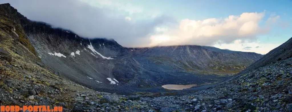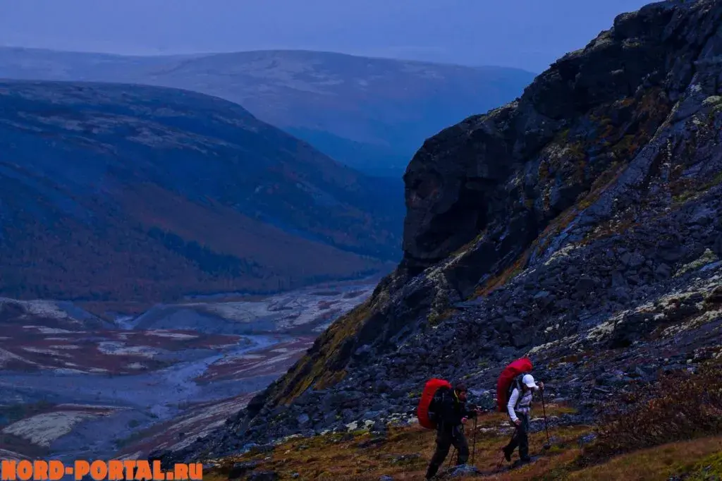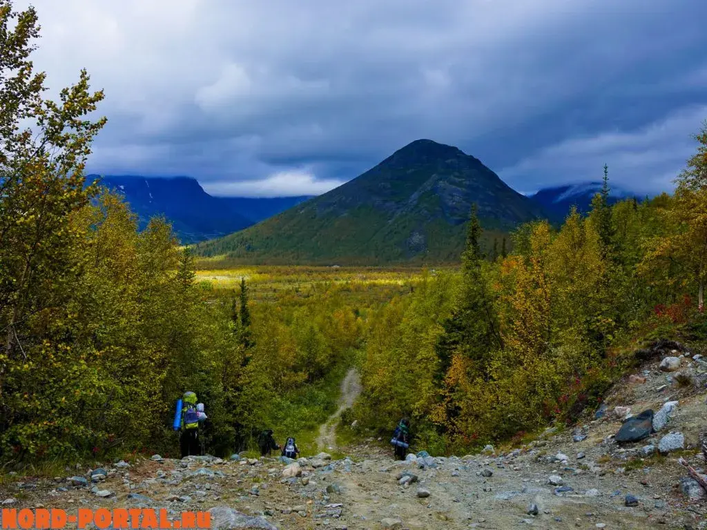 Когда мы начали спуск в долину реки Тульйок, все стало спокойнее. Нам открылся прекрасный вид: кучные полосы облаков перемежались с верхушками гор, а внизу вдоль реки пестрели яркие краски осени. Мы долго фотографировали и фотографировались на фоне этого волшебного вида. Хотелось ухватить кусочек неповторимого момента хотя бы чуть-чуть, запечатлеть его не только в памяти, но и на фото. После, мы спустились в долину, где пообедали и направились к заключительному перевалу Ворткеуайв. Здесь мы ещё раз взглянули на долину Тульйок, на Хибины, и спустились к посёлку Кукисвумчорр.
