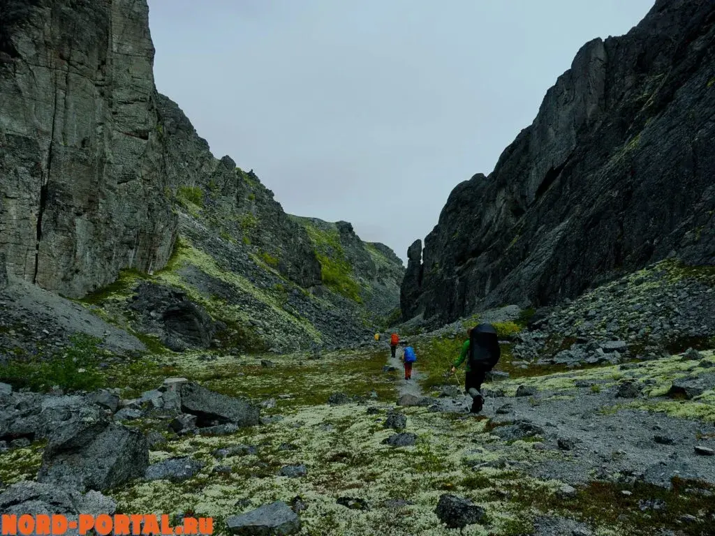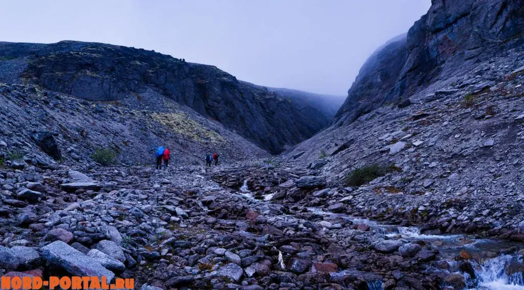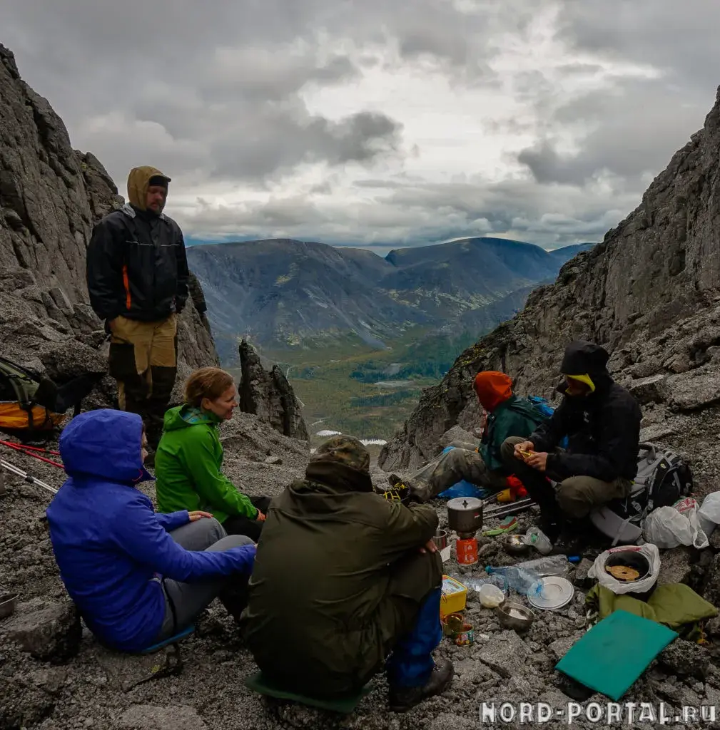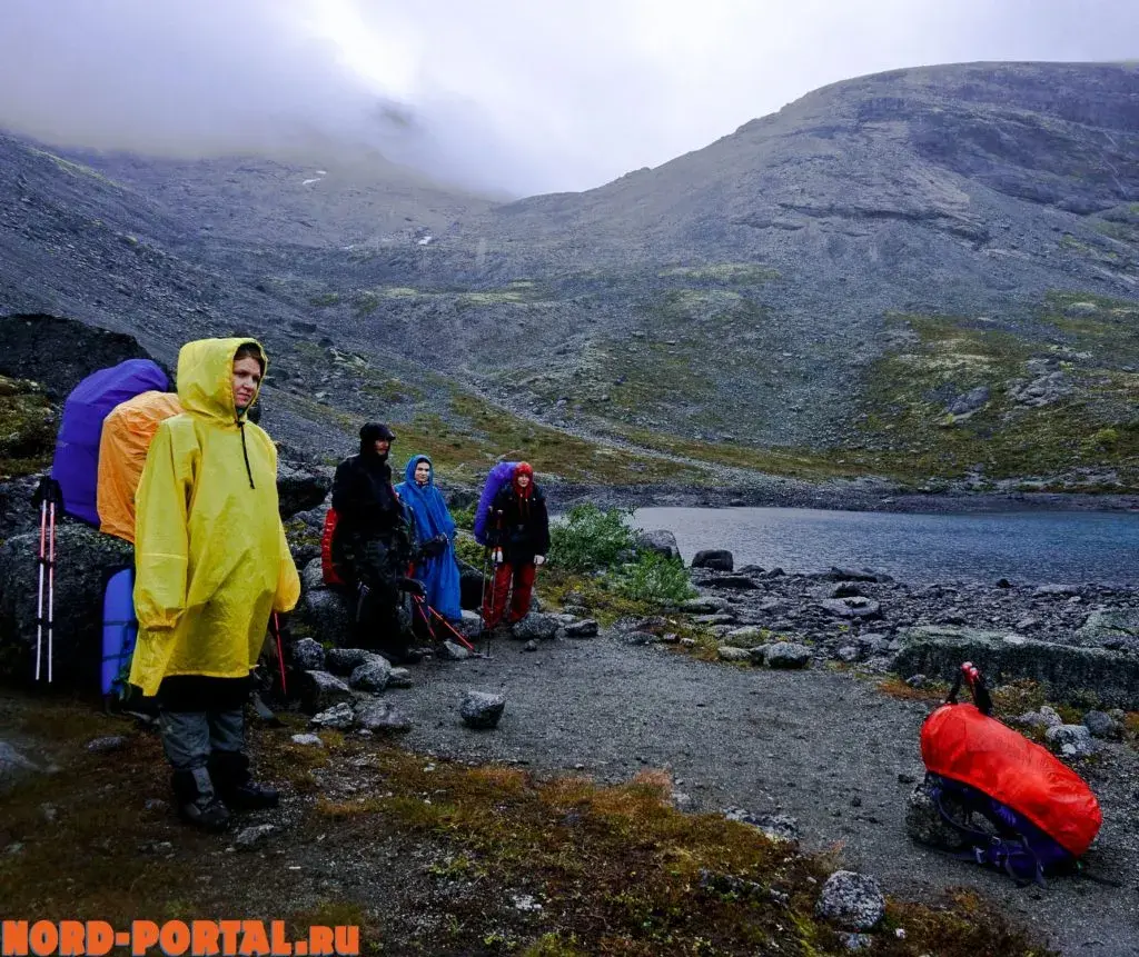 Во второй день нашего похода мы ощутили всю прелесть северной погоды с самого утра, когда все завтракали под звуки барабанящего по тенту дождя. Мы выдвинулись от озера «Тюменского чудовища», дождь шёл почти весь день. Мы шли, и дождь шёл с нами. В этот день нам предстояло пройти довольно сложный перевал – Южный Чорргорр, затяжной подъем, а спуск… Он отнял много сил из-за своей каменистости, когда бредёшь в облаке, петляя среди огромных глыб. Запоздалый обед устроили прямо под перевалом, укрывшись от мороси за очередным каменным «автобусом». Ребятам с небольшим походным опытом он дался тяжело, но мы все же его одолели, не потеряв бодрость духа.