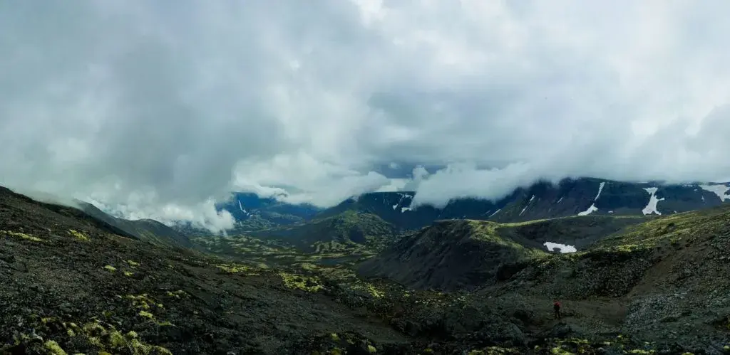 Рано утром мы попрощались с Никитой, собрались и лениво выдвинулись в путь. Было тепло, даже немного жарко. По дороге зашли полюбоваться водопадом Красивый, после чего направились по долине к ущелью Рисчорр. Когда мы подошли к ущелью, на нас опустилось плотное молочное облако. Мы шли в туманной дымке как ёжики в тумане: под ногами снежник, по бокам высокие стены ущелья, сложенные словно из мозаики. Ни сзади, ни спереди ничего не видно.