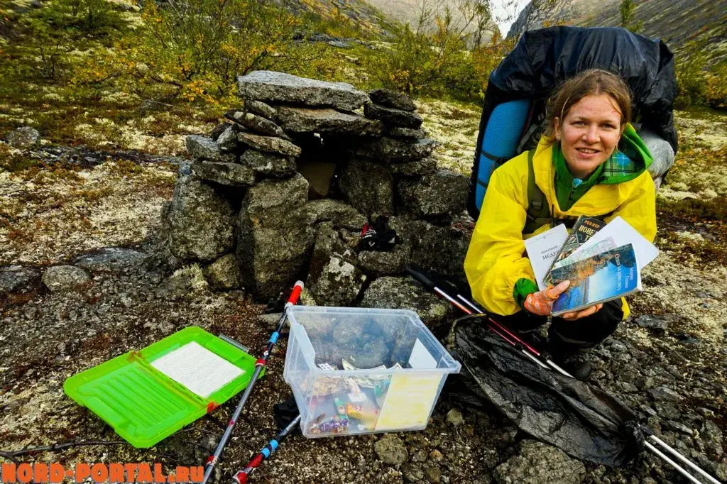 Погода была как капризный ребёнок – то плакала, то смеялась, но к концу дня успокоилась и на лице неба прояснилась солнечная улыбка. Пройдя перевал Юмъекорр, мы нашли библиотеку. Да, да, именно, библиотеку. Это был пластиковый короб с зелёной крышкой, уютно спрятанный в камнях. Открыв эту сокровищницу, мы нашли несколько книг, пару конфет, орешки и сухофрукты. На крышке короба было написано, что это один из пунктов библиотеки Хибин и здесь можно взять книгу и вернуть её на оз. Академическом. Стоянка на озере входила в наши планы. Аня выбрала одну книгу, чтобы почитать на досуге.